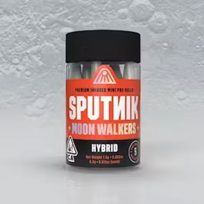 The SPUTNIK 7pk Hybrid Moon Walkers (3.5g) by Sputnik is an infused 1g pre-roll delivering enhanced potency and flavor. Ideal for those seeking a stronger experience, it offers rich flavor and enhanced effects. Priced at $21.25.
